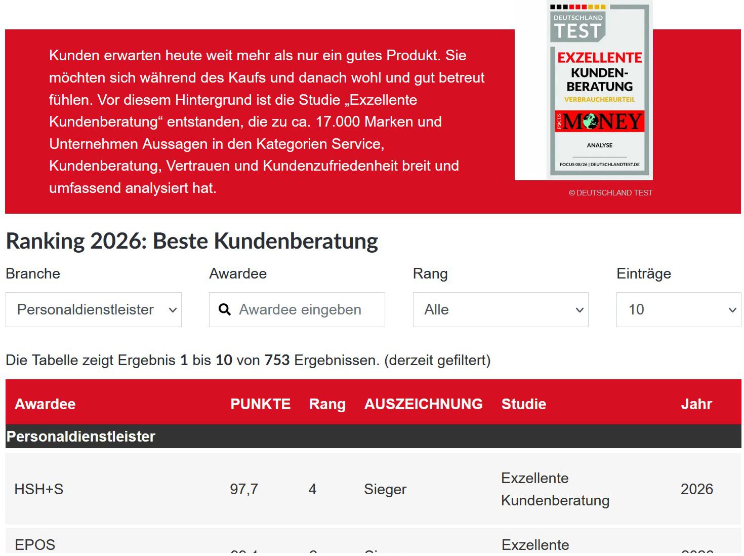 Ein weiterer wichtiger Aspekt ist den Auftraggebern die partnerschaftliche und ehrliche Kundenberatung. Auf Basis von 17.000 befragten Unternehmen bewerten Arbeitgeber die Beratung von HSH+S im Februar 2026 als exzellent und deshalb ausgezeichnet. In Focus Money listet Burda Media die HSH+S Personalberatung auf Rang 4 aller Personaldienstleister.